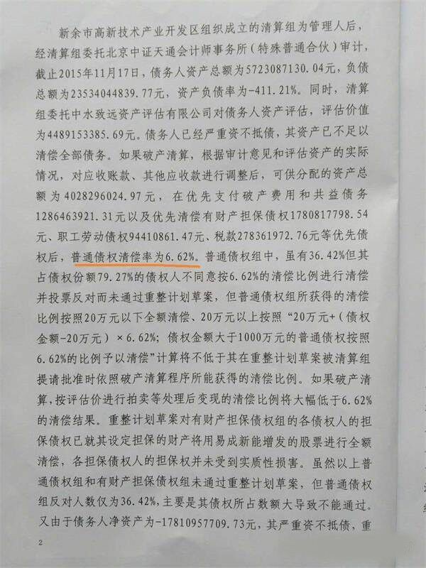 2016年8月12日,賽維第二次債權(quán)人會(huì)議,資產(chǎn)評(píng)估近為76.5億,各債權(quán)銀行整體清償率為14.75%,遠(yuǎn)低于無(wú)錫尚德的31.55%和*ST超日的20%,被質(zhì)疑明為重整實(shí)為破清算,因此兩次投票都遭遇債僅銀行否決。