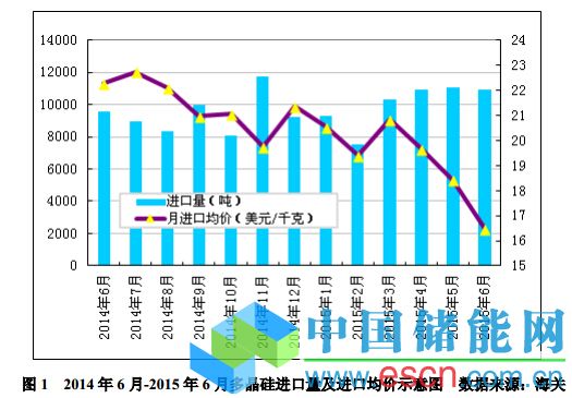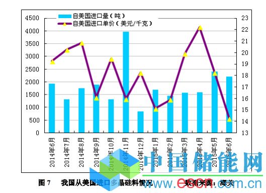 2015年6月份從美國(guó)進(jìn)口多晶硅量降至2202噸,環(huán)比降幅為8.5%;6月份進(jìn)口單價(jià)大幅下滑至14.25美元/千克,環(huán)比降幅為21.9%。2015年上半年從美國(guó)進(jìn)口多晶硅量為10903噸,同比增幅為8.7%;上半年進(jìn)口均價(jià)為17.47美元/千克,同比降幅為10.2%。
