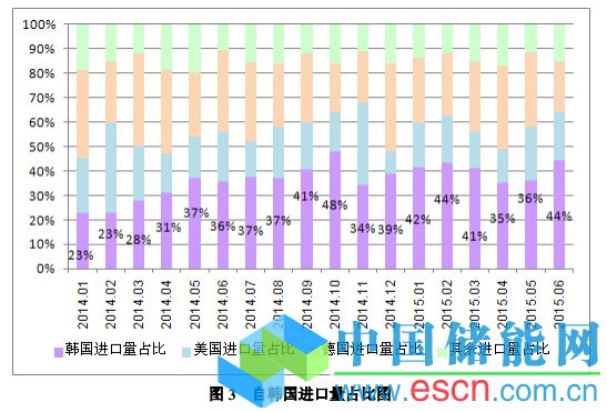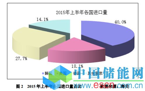 有色協(xié)會(huì)硅業(yè)分會(huì)認(rèn)為,致使2015年上半年多晶硅月均進(jìn)口量超過萬噸的主要原因有:第一,6月份自韓國(guó)進(jìn)口量再創(chuàng)歷史新高,超過美國(guó)和德國(guó)當(dāng)月進(jìn)口總量,達(dá)到4833噸,環(huán)比大幅增加20.0%,占總進(jìn)口量的44.2%,上半年累計(jì)自韓國(guó)進(jìn)口24033噸,占累計(jì)總進(jìn)口量的40.0%,連續(xù)一年以上維持進(jìn)口量首位;