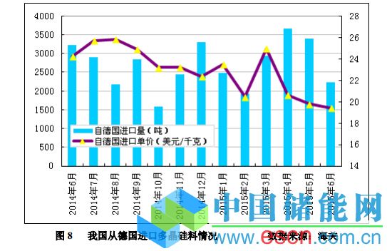 2015年6月份從德國(guó)進(jìn)口多晶硅量減少至2242噸,環(huán)比降幅為34.1%;6月份進(jìn)口單價(jià)下滑至19.41美元/千克,環(huán)比跌幅為1.9%。2015年上半年從德國(guó)進(jìn)口多晶硅量為16660噸,同比增幅為11.1%;上半年進(jìn)口均價(jià)為21.46美元/千克,同比降幅為5.5%。