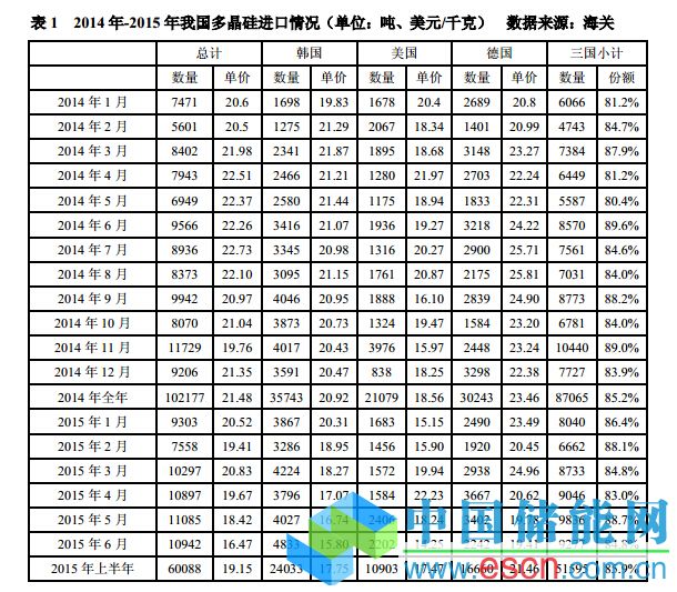 中國(guó)儲(chǔ)能網(wǎng)訊:根據(jù)海關(guān)最新數(shù)據(jù)統(tǒng)計(jì),2015年6月份我國(guó)多晶硅進(jìn)口量為10942噸,仍維持在萬噸以上,主要是由于當(dāng)月從韓國(guó)進(jìn)口量創(chuàng)歷史新高達(dá)到4833噸所致。上半年累計(jì)進(jìn)口多晶硅為60088噸,比去年同期大幅增加30.8%,月均進(jìn)口量超過萬噸,占國(guó)內(nèi)月均供應(yīng)量的44%。上半年通過加工貿(mào)易進(jìn)口多晶硅量為36223噸,占累計(jì)總進(jìn)口量的60.3%,其中6月份自美國(guó)按加工貿(mào)易方式進(jìn)口量為2196噸,占當(dāng)月自美國(guó)進(jìn)口總量的99.8%,達(dá)到前所未有的加工貿(mào)易最高占比!另外,來自美、韓、德三國(guó)的多晶硅繼續(xù)低價(jià)沖擊,6月份進(jìn)口均價(jià)大幅下跌至16.47美元/千克,同比大幅下滑26.0%,創(chuàng)歷史新低!其中韓國(guó)和德國(guó)多晶硅價(jià)格同樣創(chuàng)歷史新低,分別降至15.80美元/千克和19.41美元/千克,同比降幅分別為25.0%和19.9%,6月份從美國(guó)進(jìn)口價(jià)格也大幅下滑21.9%至14.25美元/千克。上半年累計(jì)進(jìn)口均價(jià)為19.15美元/千克,同比下滑12.1%。進(jìn)口多晶硅的量增價(jià)跌“雙重壓制”導(dǎo)致國(guó)內(nèi)多晶硅企業(yè)庫(kù)存高企,國(guó)內(nèi)價(jià)格一路下滑幾近跌破成本線,進(jìn)口傾銷對(duì)國(guó)內(nèi)市場(chǎng)造成的沖擊仍在持續(xù)。