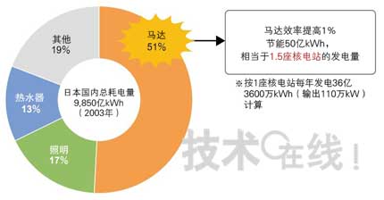 新式馬達(dá)最有望在節(jié)能方面收到廣泛的效果。有試算結(jié)果表明,馬達(dá)的耗電占到日本國內(nèi)總耗電量9850億kWh的51%(圖2)。如果馬達(dá)驅(qū)動的機器效率能提高1%,則可節(jié)約1.5座核電站的發(fā)電量。
