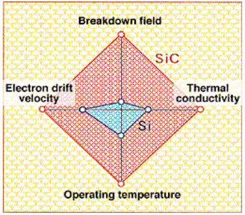 碳化硅物理特性與硅有很大不同。單晶碳化硅比單晶硅具有很多優(yōu)越的物理特性,例如大約10倍的電場強(qiáng)度、大約高3倍的熱導(dǎo)率、大約寬3倍禁帶寬度、大約高一倍的飽和漂移速度。除此之外,在具體的應(yīng)用上,雖然碳化硅器件的工藝難度比單晶硅大很多,但是一旦解決工藝問題,碳化硅器件制造流程短,體積重量小、抗氧化壽命長、輸出功率高的特點(diǎn),將使其成為遠(yuǎn)優(yōu)于單晶硅的21世紀(jì)理想半導(dǎo)體材料。而且碳化硅材料對電力的能耗極低,按照如果年產(chǎn)40萬片碳化硅晶片襯底的計劃,僅僅應(yīng)用在照明領(lǐng)域,每年減耗的電能就相當(dāng)于節(jié)約2600萬噸標(biāo)準(zhǔn)煤,是一種理想的節(jié)能材料。