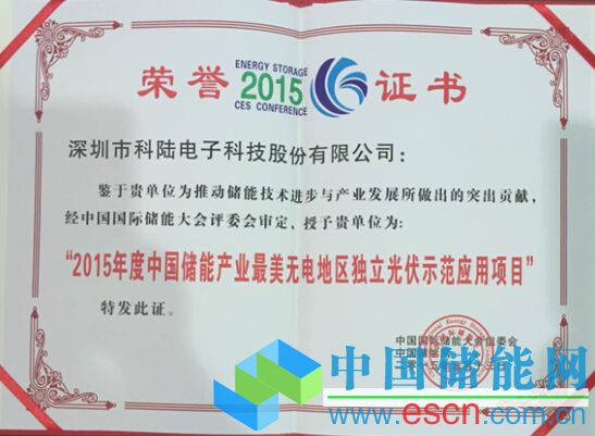 3. 深圳市科陸電子科技股份有限公司榮獲“2015中國儲能產(chǎn)業(yè)最美無電地區(qū)獨立光伏示范應(yīng)用項目獎 ”