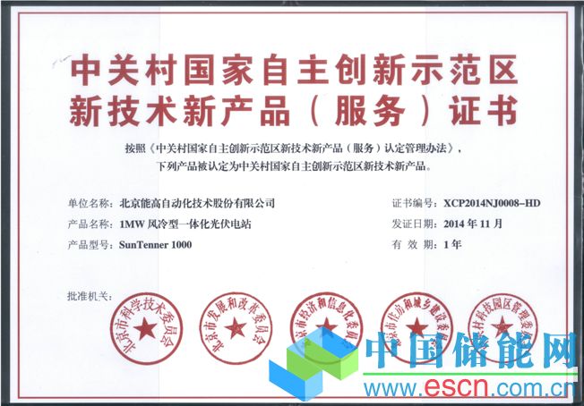 經(jīng)公示無異議,日前,北京能高1MW風冷型一體化光伏電站順利獲得中關村國家自主創(chuàng)新示范區(qū)新技術新產(chǎn)品(服務)認證。