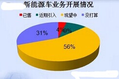 對于新能源車業(yè)務(wù)開展情況,僅有4%的經(jīng)銷商開始銷售新能源汽車,31%的經(jīng)銷商表示沒有開展新能源汽車的銷售計劃,56%的經(jīng)銷商還處于觀望狀態(tài),經(jīng)銷商對今年2萬輛的銷售指標(biāo)能夠完成多少心存疑問。