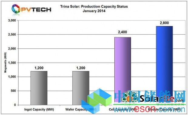 天合光能2014年初內(nèi)部太陽能電池產(chǎn)量為2,400MW,內(nèi)部光伏組件產(chǎn)能為2,800MW,產(chǎn)生400MW的電池產(chǎn)量差距。