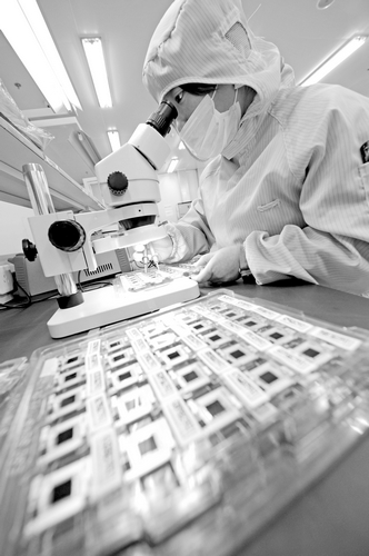 中國(guó)儲(chǔ)能網(wǎng)訊:2月8日,安徽淮南日芯光伏科技有限公司工人生產(chǎn)高倍聚光光伏產(chǎn)品?;茨先招竟夥萍加邢薰咀鳛橹袊?guó)最大的LED芯片生產(chǎn)與制造企業(yè)三安光電的全資子公司,2013年,該公司完成固定資產(chǎn)投資7億元,實(shí)現(xiàn)產(chǎn)值9.5億元,利潤(rùn)額9600多萬元,模組年產(chǎn)制造能力超過200兆瓦,其公司設(shè)計(jì)生產(chǎn)的1000倍聚光發(fā)電系統(tǒng)效率高達(dá)27%,模組效率接近30%,屬世界領(lǐng)先水平。