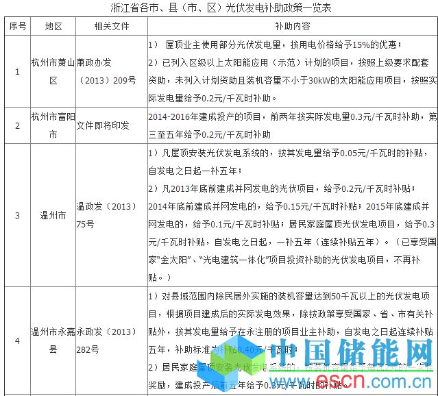繼國家和浙江省內(nèi)出臺(tái)相應(yīng)光伏發(fā)電補(bǔ)貼政策后,各市縣政府、發(fā)改部門按照國家和浙江省政府部署,迅速行動(dòng),認(rèn)真編制光伏發(fā)電規(guī)劃,出臺(tái)鼓勵(lì)政策制定。目前,嘉興、溫州、衢州等市,秀洲、蕭山、海寧、龍游、江山等縣(市、區(qū))克服地方財(cái)政困難,已率先出臺(tái)地方光伏發(fā)電支持政策;臺(tái)州、寧波、杭州等地區(qū)正在積極制定相關(guān)政策,地方政策的出臺(tái)將有效帶動(dòng)地方光伏發(fā)電推廣應(yīng)用,有效促進(jìn)浙江省光伏產(chǎn)業(yè)健康發(fā)展。各市、縣(市、區(qū))光伏發(fā)電補(bǔ)助政策附后。