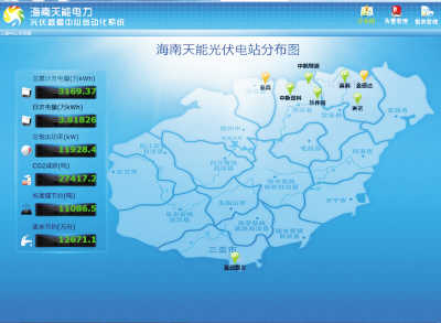 2011年,海南天能電力投資建設(shè)的國家第一批 “金太陽”示范項目“臨高20兆瓦光伏并網(wǎng)示范工程”項目成功并網(wǎng)。在這個被業(yè)內(nèi)譽(yù)為“最美光伏電站”的控制室里,一個巨大電子屏占據(jù)了一面墻。從這塊顯示海南省地圖的電子屏上,清晰地標(biāo)示著由海南天能電力承建的所有光伏項目的分布位置,顯示著各個電站的運行情況。工作人員介紹,現(xiàn)在整個控制系統(tǒng)通過監(jiān)控設(shè)備與互聯(lián)網(wǎng)的聯(lián)接,可方便及時了解分布各處光伏電站的運營情況;通過記錄的發(fā)電信息,也可以實現(xiàn)各個電源點之間的調(diào)度平衡。