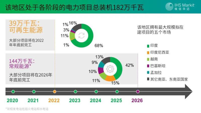 2020年初,埃信華邁(IHS Markit)南亞和東南亞電力團(tuán)隊(duì)考察了各個(gè)電力市場,并指出了該地區(qū)最為值得關(guān)注的問題。這些市場的電力需求依然增長旺盛,因此需要在國家層面或地區(qū)層面增加裝機(jī),以避免電力短缺。目前,處于各階段的擬在建電力項(xiàng)目總裝機(jī)為182萬千瓦 ,其中有39萬千瓦可再生能源發(fā)電容量將于2022年裝機(jī)完成,其余144萬千瓦常規(guī)電力項(xiàng)目則定于2026年年底前陸續(xù)完工。