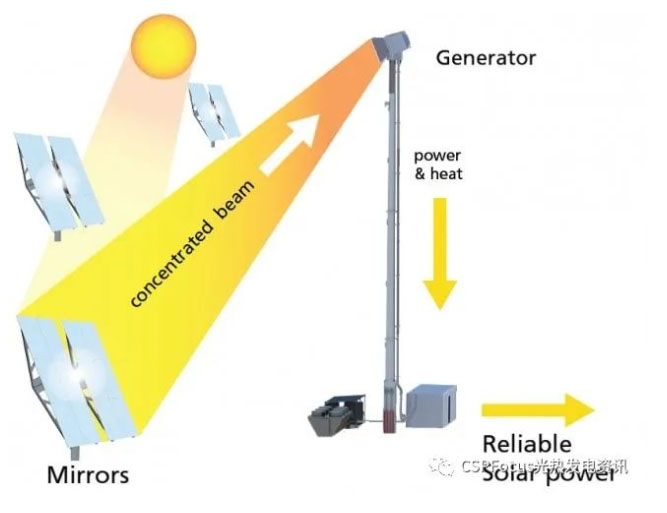 RayGen的太陽能技術(shù)為一種集合了光熱發(fā)電和光伏發(fā)電為一體的創(chuàng)新型塔式太陽能發(fā)電技術(shù),稱之為CSPV。和常見的塔式技術(shù)一樣,其采用定日鏡反射陽光至集熱塔產(chǎn)生高溫?zé)崮?,聚光倍?shù)為750倍。