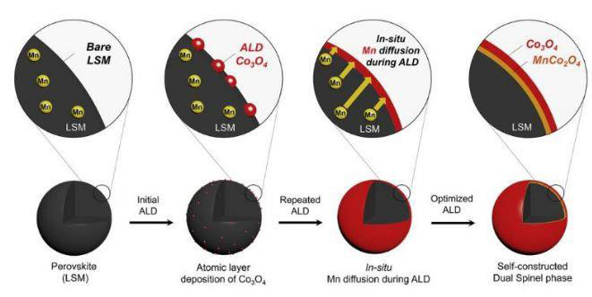 “在原子層沉積(ALD)過程的反復(fù)沉積和氧化循環(huán)中,Mn陽離子從LSM 擴(kuò)散到Co3O4中,因此,LSM-20-Co催化劑由LSM封裝而成,該LSM被自重構(gòu)尖晶石中間層(Co3O4 / MnCo32O4 / LSM)?!?