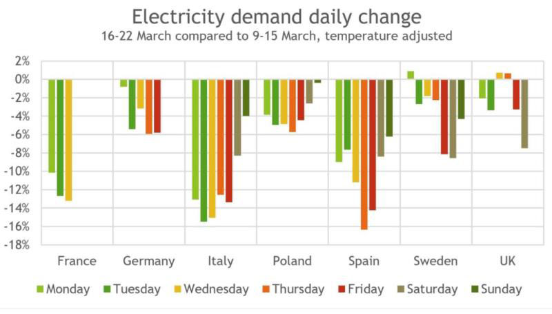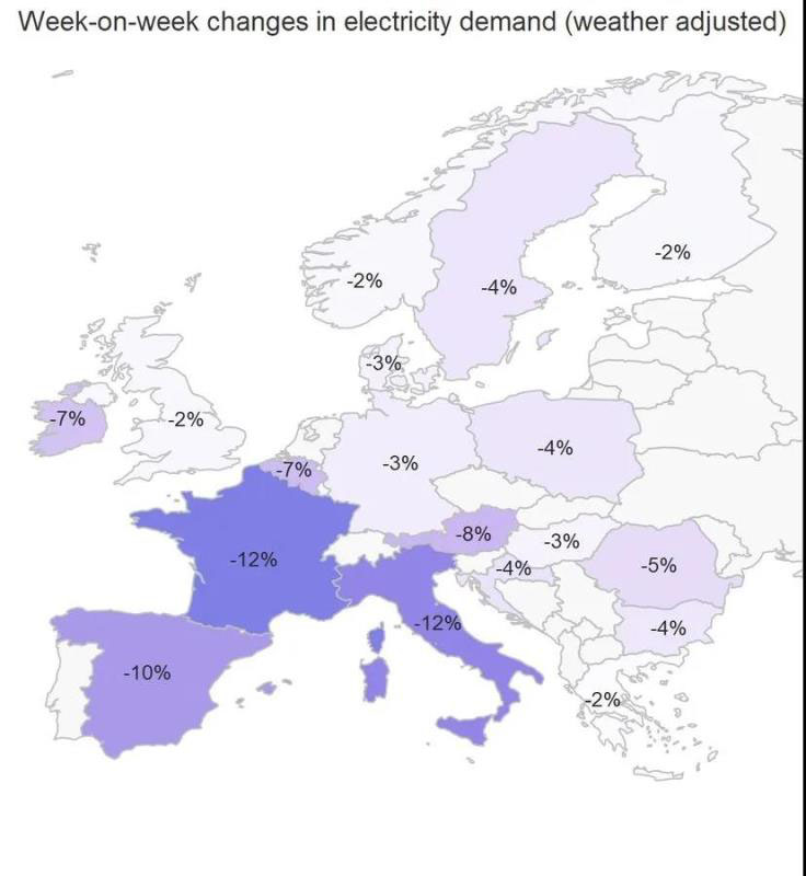根據(jù)ember-climate.org網(wǎng)站匯總的數(shù)據(jù),隨著疫情的蔓延3月2日至8日這一周與上一周相比,歐洲各國電力需求(氣溫變化已經(jīng)調整)下降在-2%到-12%之間,具體如下: