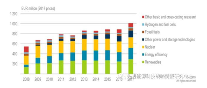 為了推動“能源轉(zhuǎn)型”戰(zhàn)略的發(fā)展,德國持續(xù)增加對能源技術(shù)研發(fā)的公共投入,2017年,德國投入10.1億美元用于能源相關(guān)的研究、開發(fā)和示范(RD&D),占其GDP的0.031%,相比前一年增長了14%。其中,可再生能源技術(shù)占能源RD&D總預算的29%,主要用于太陽能和風能研究;其次是能效(主要用于提高工業(yè)能效)和核能(包括核聚變),分別占22%和21%;其他電力和儲能技術(shù)占到13%,化石燃料僅占5%,其中一半以上用于碳捕集和利用的研究。此外,德國各州也投入資金支持能源技術(shù)研究,2016年德國各州的支出總額超過了2.48億歐元。