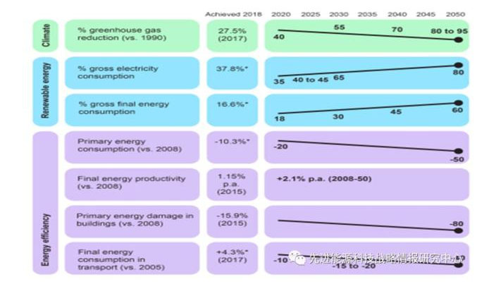 可再生能源是德國能源轉(zhuǎn)型的核心,根據(jù)其歐盟義務(wù)以及國家政策和立法制定了一套完善的短、中、長期可再生能源目標,包括:到2020年可再生能源在終端能源消費中占比18%,在發(fā)電量中占比35%;到2030年可再生能源在終端能源消費中占比30%,在發(fā)電量中占比65%;到2050年可再生能源在終端能源消費中占比60%,在發(fā)電量中占比80%。