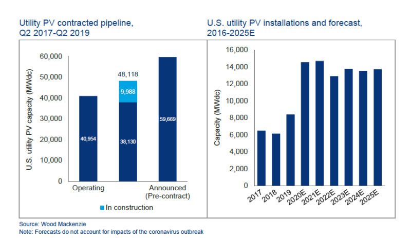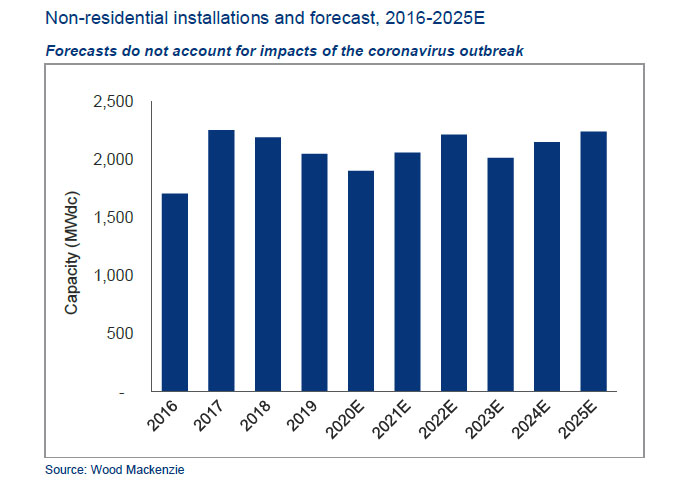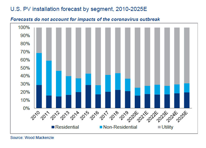 Wood Mackenzie預(yù)測(cè),2020年的年增長(zhǎng)率為47%,預(yù)計(jì)裝機(jī)量將達(dá)到20 GW,在投資稅收抵免到期之前,2021年年裝機(jī)量在20.4 GW,未來(lái)五年,美國(guó)光伏總裝機(jī)容量將翻一番以上。到2025年,三分之二的屋頂太陽(yáng)能和四分之一的非住宅太陽(yáng)能將配備儲(chǔ)能。需要注意的是,WoodMac表示該報(bào)告在出版時(shí)COVID-19病毒仍在全球蔓延,對(duì)太陽(yáng)能行業(yè)的影響仍在發(fā)展中,鑒于這種動(dòng)態(tài)變化,WoodMac暫未將病毒爆發(fā)的影響納入該報(bào)告。