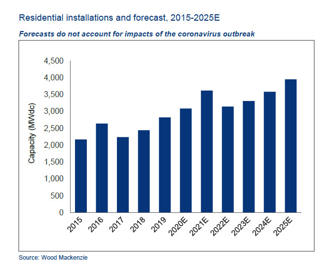 住宅太陽(yáng)能保持健康增長(zhǎng)狀態(tài),相比2018年增長(zhǎng)了15%,是2016年以來(lái)的最高年增長(zhǎng)率。