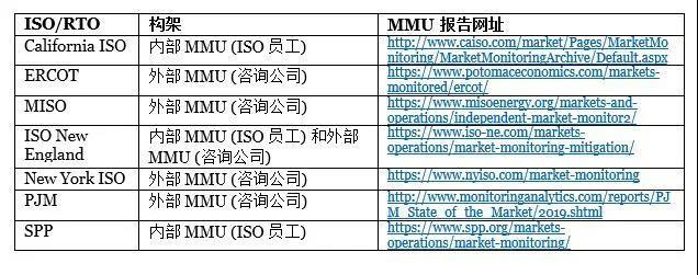 每個ISO / RTO的詳細(xì)市場和運營規(guī)則均需獲得FERC的批準(zhǔn)[12],其中包括確保MMU具有獨立地位的陳述。有幾個ISO / RTO(作為FERC批準(zhǔn)的市場監(jiān)測計劃的一部分)將獨立監(jiān)測功能外包給具有專業(yè)經(jīng)驗的咨詢公司[13]。參見表1。如果獨立的MMU由ISOs / RTO的員工(而非咨詢公司員工)組成,則被稱為“內(nèi)部獨立市場監(jiān)測部門” [14]。但是,ISOs / RTO的管理層不能控制或者對其施加權(quán)力。例如,在稱為SPP(西南電力庫)的ISO / RTO中有一個內(nèi)部MMU,經(jīng)FERC批準(zhǔn)的管理規(guī)則規(guī)定:“應(yīng)授予市場監(jiān)測機(jī)構(gòu)完全的獨立性,以開展為提供公正和有效市場監(jiān)測所需的活動?!盵15] 此外,根據(jù)SPP規(guī)則,“市場監(jiān)測機(jī)構(gòu)在制定和完成報告時應(yīng)具有完全的獨立性,任何個人或?qū)嶓w都不得篩選、更改、刪除或延遲市場監(jiān)測機(jī)構(gòu)的發(fā)現(xiàn)、結(jié)論和建議。”[16]