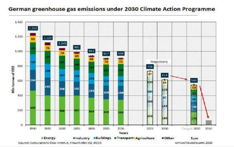 在應(yīng)用生態(tài)研究所(ko-Institut)的主持下進行的分析發(fā)現(xiàn):“根據(jù)當(dāng)前的氣候行動計劃,將無法實現(xiàn)2020年和2030年的氣候目標(biāo)。”政府承諾在2019年9月啟動該計劃后,將對其有效性進行獨立評估。該計劃中的措施,例如運輸和供暖的國家碳價,電動汽車的大規(guī)模推廣以及平行煤電等,到2030年逐步淘汰二氧化碳的排放量應(yīng)從2018年的858噸減少至5.43億噸。但是,研究發(fā)現(xiàn),減排量實際減少約7000萬噸。