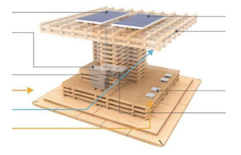 這些公司將該產(chǎn)品宣傳為城市的“熱點(diǎn)”。這個(gè)裝置的結(jié)構(gòu)特點(diǎn)是4.8 m?的底板和4 m?的屋頂,中間的空間是休息區(qū)。在該裝置的頂部有一個(gè)蒸發(fā)器,玻璃屋頂?shù)脑O(shè)計(jì)可防止直射陽(yáng)光的傷害。因?yàn)镃ool Tree Lite是由柏木制成的,所以它需要由螺栓連接起來(lái),這種結(jié)構(gòu)方便根據(jù)特殊場(chǎng)合的需求拆卸和重新組裝。