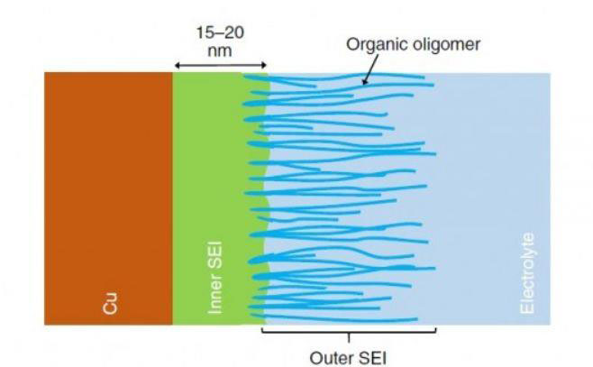 在電池充電初期,電極/電解質(zhì)界面會形成電雙層。這種雙層結(jié)構(gòu)導(dǎo)致SEI的微結(jié)構(gòu)和化學(xué)差異,并最終決定電池性能。從分子水平上了解這種界面,可以為更好地設(shè)計(jì)電池提供有力指導(dǎo)。研究人員發(fā)現(xiàn),初始充電期間,在任何相間化學(xué)反應(yīng)發(fā)生之前,由于溶劑分子自組合,電極/電解質(zhì)界面上會形成雙電層。這是受鋰離子和電極表面電位的影響。這一雙層結(jié)構(gòu)預(yù)測最終的相間化學(xué),特別是帶負(fù)電荷的電極表面,排斥來自內(nèi)層的鹽陰離子,從而在內(nèi)部產(chǎn)生薄且致密的無機(jī)SEI。正是這一致密層負(fù)責(zé)傳導(dǎo)Li +和絕緣電子,這是SEI的主要功能。內(nèi)層形成后,出現(xiàn)電解質(zhì)可滲透且富含有機(jī)物的外層。在高濃度富氟電解質(zhì)存在的情況下,由于雙層中存在陰離子,SEI內(nèi)層的LiF濃度較高。此類實(shí)時納米級觀測,將有助于為未來的電池設(shè)計(jì)更好的界面。