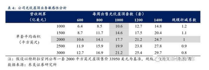 公司光伏屋頂年收入中樞在 15-20 億美元。假設(shè)規(guī)模越大每平方英尺售價越便宜, 根據(jù)特斯拉官網(wǎng)公布的售價,一套 2000 平方英尺光伏屋頂售價 33950 美元,取其為 基準,給定規(guī)模折減系數(shù)為 1,單套平均面積每增大 500 平方英尺,規(guī)模折減系數(shù) 減小 0.1,每減小 500 平方英尺,規(guī)模折減系數(shù)增加 0.1,同時針對產(chǎn)業(yè)鏈上下游研 究,特斯拉光伏屋頂周出貨量在 1000 套左右。對特斯拉光伏屋頂營收規(guī)模進行敏感 性分析,營收=單套平均面積 X 出售光伏屋頂套數(shù) X 規(guī)模折減系數(shù),在中性情況周 出售 1000 套,單套平均面積 2000 平方英尺情況下,營收空間在 17.7 億美元。