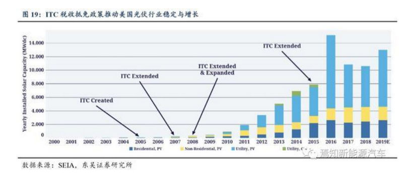 戶用光伏市場反彈加速,公用事業(yè)光伏采購欣欣向榮。加州出臺光伏新政疊加住宅 光伏裝機成本不斷下降,美國戶用光伏市場從加州擴展到其他州,14 個州的戶用光伏和 儲能設(shè)備新增安裝量創(chuàng)紀錄,成熟市場與新興市場均呈現(xiàn)反彈趨勢。光伏+儲能模式發(fā) 展迅猛,2019 年第三季度戶用光伏裝機量達 700MW,同比增長 18%。公用事業(yè)光伏市 場方面,ITC 政策即將到期和光伏發(fā)電成本不斷下降,公用事業(yè)項目迅速增加,2019 年 裝機量預(yù)計為 8.4GW,2019-2024 年增幅將超過 20%。