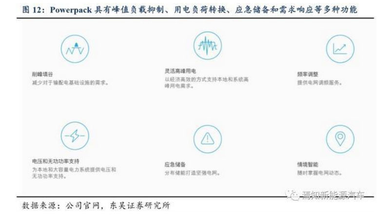 Powerpack 系統(tǒng)是一個完全集成的能量存儲解決方案,能夠?qū)崿F(xiàn)商業(yè)與公用事業(yè)場 景中的易控、安全、穩(wěn)定用電。Powerpack 中包含高達 210kWh(AC)的電池組和高達 625kVa 的逆變器。Powerpack 系統(tǒng)可根據(jù)任何場所的空間、電力和能源需求進行擴展, 適用于小型商業(yè)企業(yè)到區(qū)域公用事業(yè)的各種場景。在公共事業(yè)規(guī)模的系統(tǒng)上,通過和電 網(wǎng)綁定的雙向逆變器,這些系統(tǒng)能夠提供 2 至 4 小時持續(xù)純電力輸出。目前,基于 Powerpack 技術(shù)的大型太陽能發(fā)電廠已經(jīng)開始為夏威夷的考艾島提供電力。2017 年 12 月,全球最大的鋰離子電池系統(tǒng)在澳大利亞順利完工,總裝機容量為 129MWh, Powerpack 系統(tǒng)將應(yīng)用于澳大利亞 30000 個家庭的電力供應(yīng)。