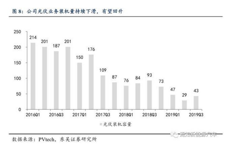 受益于改革措施和加州新政,持續(xù)下滑的光伏業(yè)務(wù)裝機量有望實現(xiàn)回升。特斯拉曾 經(jīng)是美國光伏市場的領(lǐng)導(dǎo)者,市場占有率達 33%。受 Gigafactory 電池生產(chǎn)與電動汽車 產(chǎn)能分配限制,公司光伏業(yè)務(wù)裝機量從 2016 年第一季度 214MW 下降至 2019 年第三季 度 43MW,市場份額下滑至第四位,市場占有率約為 6%。2019 年馬斯克提出大大提高 光伏裝機速度的重要任務(wù),公司在光伏銷售結(jié)構(gòu)上進行了一系列重大的逆勢改革,將銷售渠道從門店轉(zhuǎn)移到店內(nèi)再轉(zhuǎn)移到線上銷售,不斷降低獲客成本;同時推出光伏租賃業(yè) 務(wù),客戶可以以每月 50 美元的價格租賃光伏系統(tǒng)。此外,根據(jù)加州能源委員會頒布的 《2019 建筑能效標準》要求,從 2020 年 1 月 1 日開始,所有在加利福尼亞州新建的三 層及三層以下的低層住宅(包括獨棟)都將被要求強制安裝住宅光伏系統(tǒng)。該項新政策 在未來有望拉動光伏業(yè)務(wù)裝機量逐漸回升。