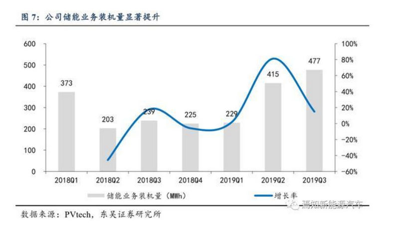 公司儲能部署大幅提升,2019 年儲能項目部署將超過 1GWh,全球總存儲量超過 2GWh。自 Powerwall 與 Powerpack 系統(tǒng)發(fā)布以來,公司的儲能業(yè)務(wù)大幅擴張,儲能部 署逐年遞增,2019 年第三季度公司儲能業(yè)務(wù)部署達到 477MWh。2019 年公司與其他三 家公司共同獲得加州 2.2GWh 儲能項目用以取代 3 座天然氣廠,特斯拉負責的項目為182.5MW/730MWh,公司儲能大幅增長,未來仍將保持指數(shù)級增長速度。