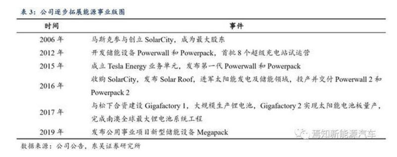 公司以促進可持續(xù)發(fā)展為己任,逐步拓展新能源事業(yè)版圖。自 2012 年起,公司開始研發(fā)儲能設(shè)備。2015 年 3 月,公司成立 Tesla Energy 業(yè)務(wù)單元,發(fā)布第一代針對于居 民住宅的Powerwall和針對于企業(yè)和公用事業(yè)的Powerpack。2016年,公司收購SolarCity, 發(fā)布 Solar Roof,進軍太陽能發(fā)電領(lǐng)域。2017 年 1 月,公司與日本松下合資在內(nèi)華達州 建立主要用于大規(guī)模生產(chǎn)電池的 Gigafactory 1,主要供應(yīng)于 Model 3、Powerwall 2 和 Powerpack 2,Gigafactory 2 實現(xiàn)太陽能電池板量產(chǎn)。2019 年 7 月,發(fā)布專門用于公用事 業(yè)項目的新型儲能產(chǎn)品 Megapack,即將在加利福尼亞州與太平洋天然氣和電力公司 (PG&E)合作,用該產(chǎn)品替代天然氣峰值發(fā)電廠。