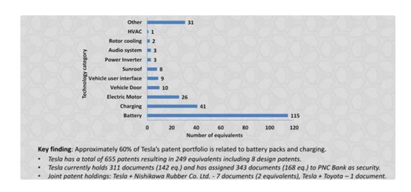 特斯拉專利的分布統(tǒng)計,來源:Relecura