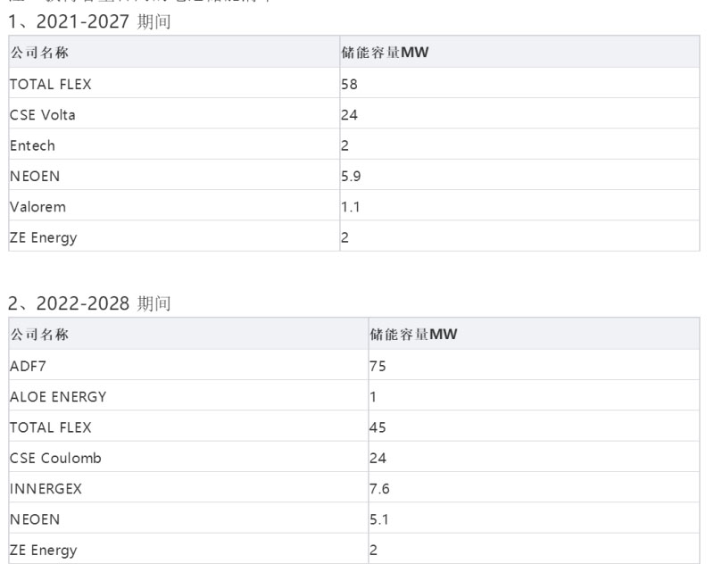 盡管目前法國(guó)市場(chǎng)規(guī)則中沒(méi)有這樣的規(guī)定,但在這四次拍賣(mài)中,只有兩次授予了容量合同(期限為2021-2027年和2022-2028年),因?yàn)?020-2026年和2023-2029年期間的容量已達(dá)上限。價(jià)格為29000歐元/MW/年(2021年期間),以及28000歐元/MW/年(2022年期間),今年的平均結(jié)算價(jià)格為20000歐元/MW/年。這些容量市場(chǎng)的合同與差價(jià)合同(Contractsfor Difference,CFDs)的使用規(guī)則相同。但是法國(guó)市場(chǎng)的一些大公司,例如EDF、NWEnergy等都缺席了這次拍賣(mài),因?yàn)樗鼈円呀?jīng)分別宣布過(guò)各自的大規(guī)模儲(chǔ)能項(xiàng)目規(guī)劃。