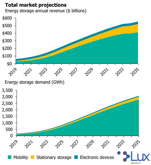 電動汽車仍然是影響儲能年收入和市場裝機規(guī)模的長期驅(qū)動因素,按年度收入計算,2035年其所占份額為74%,按裝機規(guī)模計算的份額為91%。而電子設(shè)備從2018年起開始成為儲能的第二大應用領(lǐng)域,是固定式儲能領(lǐng)域的三倍之多,預計未來,該領(lǐng)域增長相對比較平穩(wěn),并且預計到2023年,將會被固定式儲能領(lǐng)域超過,屆時,Lux Research認為,固定式儲能領(lǐng)域的年收入將達到304億美元,裝機規(guī)模將達到52.5GWh。而這一增長趨勢則是主要受幾種關(guān)鍵的創(chuàng)新型技術(shù)(包括固態(tài)電池和液流電池)的商業(yè)化推動而影響的。