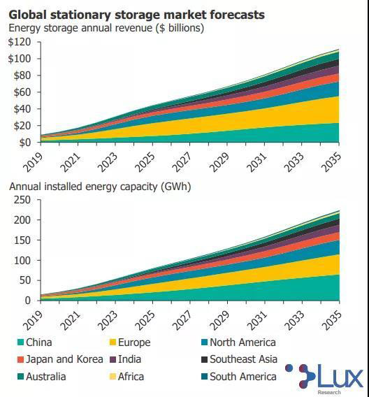 在固定式儲能領(lǐng)域中,隨著儲能系統(tǒng)成本的下降、可再生能源的興起和電力市場的自由化,到2035年,其年收入有望從去年的91億美元增長到1118億美元,裝機規(guī)模將從15.2GWh增長到222.7GWh。