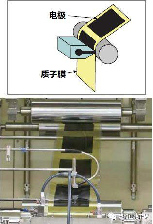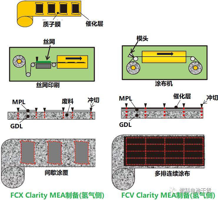 2008款FCX Clarity燃料電池膜電極制備技術(shù)主要包括基底層上微孔層涂覆技術(shù)和質(zhì)子膜上催化層涂覆技術(shù)。如前所述,2008款燃料電池膜電極中催化層為矩形,質(zhì)子膜和氣體擴(kuò)散層為不規(guī)則矩形狀。由于發(fā)電區(qū)限于催化層,導(dǎo)致質(zhì)子膜和氣體擴(kuò)散層面積利用率較低。在新一代FCV Clarity燃料電池中,膜電極外圍設(shè)立了樹(shù)脂邊框,發(fā)電區(qū)域形狀規(guī)則化。發(fā)電區(qū)域形狀矩形化后可使微孔層和催化層在卷狀擴(kuò)散層上涂覆形成,之后采用多腔沖孔法將膜電極沖切下來(lái),從而實(shí)現(xiàn)高速連續(xù)生產(chǎn),如下圖所示。上述措施大大提高了材料利用率,在膜電極面積相同情況下,質(zhì)子膜和擴(kuò)散層使用量降低了40%,提高產(chǎn)量,降低成本。