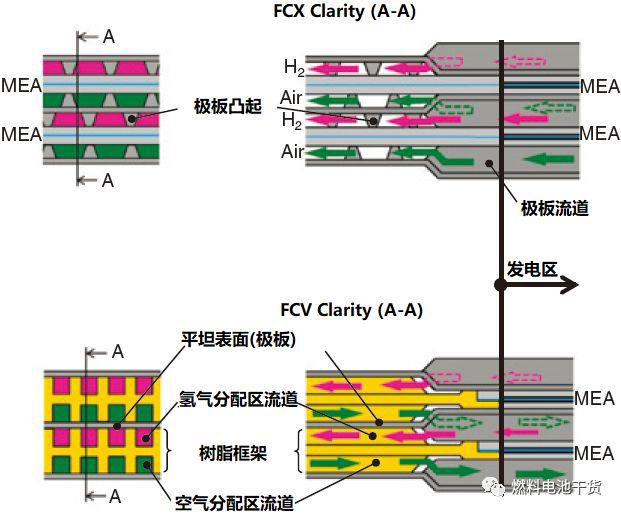 2016款FCV Clarity燃料電池對(duì)膜電極外圍的樹(shù)脂框架進(jìn)行重新設(shè)計(jì),并且與外圍樹(shù)脂框架接觸的極板保持平坦(無(wú)凹凸)。外圍樹(shù)脂框架部分設(shè)計(jì)出流槽,以給兩側(cè)分別導(dǎo)流氫氣和氧氣,保證電池表面氣體分布均勻。注意,F(xiàn)CX Clarity電池中,電極(催化層)為規(guī)則矩形狀,質(zhì)子膜和擴(kuò)散層為不規(guī)則形狀;FCV Clarity電池中,膜電極為規(guī)則矩形狀。