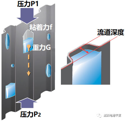 為開(kāi)發(fā)高功率密度電堆,有必要降低氣場(chǎng)槽深來(lái)減少電池厚度。但降低氣體流道深度會(huì)提高流道中水的粘著力,引發(fā)水聚集甚至堵塞。氣體流道槽深h、附著力f和排水力F的關(guān)系可以用h=f/F公式表達(dá),其中,排水力F=P1-P1+G(參考下圖)。為在減少氣體流道深度的同時(shí)兼顧實(shí)現(xiàn)穩(wěn)定輸出性能,有必要將排水力F增加到因減小流道深度而水附著力增加相同的程度。 因此,本田汽車(chē)公司開(kāi)發(fā)出了垂直進(jìn)氣電堆結(jié)構(gòu),即氫氣和空氣垂直從頂端進(jìn)入、底部出堆。
