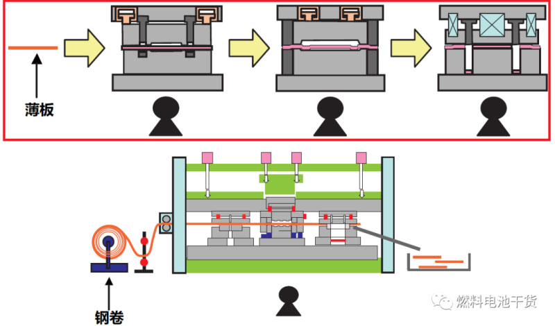 2004款FCX搭載燃料電池的CCM采用轉(zhuǎn)印法制備,即先將催化層制備在轉(zhuǎn)印膜(支撐層)上,通過(guò)熱壓法將催化層轉(zhuǎn)移到質(zhì)子膜兩側(cè),移除轉(zhuǎn)印膜即可獲得CCM。此外,2004款FCX金屬極板采用半自動(dòng)化方式連續(xù)沖壓?jiǎn)螛O板方法(2008款FCX Clarity采用高度自動(dòng)化的鋼卷漸進(jìn)式?jīng)_壓)。