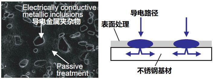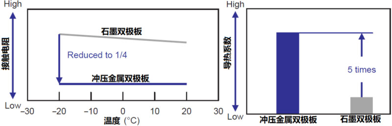 本田汽車(chē)公司2004款FCX燃料電池堆最大變化在于金屬極板取代了石墨板(相比2002款FCX)。本田汽車(chē)公司開(kāi)發(fā)了一種含導(dǎo)電涂層的不銹鋼板,利用不銹鋼的高導(dǎo)熱性和導(dǎo)電性,使得-20℃環(huán)境下不銹鋼極板接觸電阻僅為石墨極板接觸電阻1/4。高強(qiáng)度不銹鋼使得雙極板厚度做到石墨板的一半,有效提升功率密度。此外,不銹鋼極板導(dǎo)熱系數(shù)比石墨板高出約5倍,強(qiáng)化了整堆的升溫能力。最后,為有效提升導(dǎo)電性和耐腐性能,不銹鋼極板表面涂層中添加導(dǎo)電粒子(導(dǎo)電金屬夾雜物)。