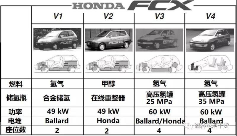 本田汽車(chē)公司自1999年正式推出搭載巴拉德電堆的燃料電池原型車(chē)FCX-V1以來(lái),一直堅(jiān)持自主研發(fā)燃料電池系統(tǒng)。第一輛原型車(chē)FCX-V1于1999年正式推出,采用了巴拉德公司功率60 kW的石墨極板燃料電池堆,系統(tǒng)輸出功率49 kW。此外,1999年也首次為測(cè)試原型車(chē)FCV-V2配備了本田自制以在線重整甲醇為氣源的質(zhì)子交換膜燃料電池堆,系統(tǒng)輸出功率49 kW(60 kW電堆)。2000年,本田分別推出搭載巴拉德公司和本田自制石墨燃料電池堆的兩款原型車(chē)FCX-V3。