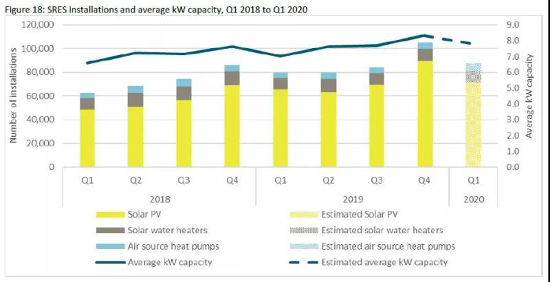 圖片:2018年第一季度至2020年第一季度,小型可再生能源系統(tǒng)的裝機設施及平均發(fā)電容量柱狀圖。來源:CER