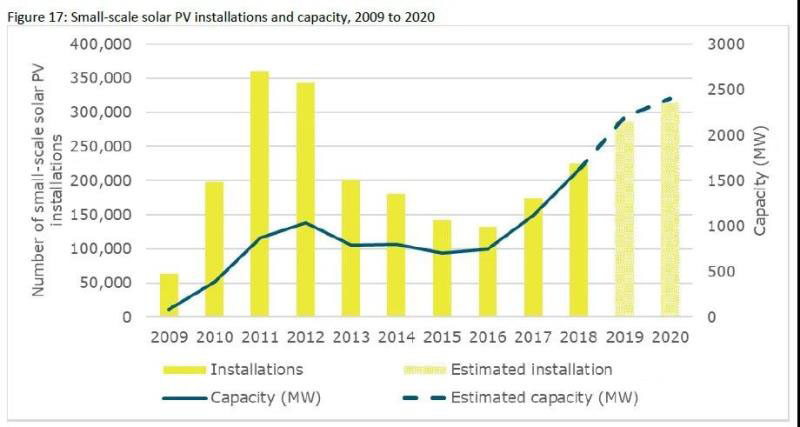 自小型可再生能源計劃(SRES)實施以來,總裝機容量達10.3GW,其中99.9%來自小型光伏發(fā)電,其余來自小型風能和水能發(fā)電。到2019年,估計澳大利亞小型光伏發(fā)電裝機容量已達到22GW。
