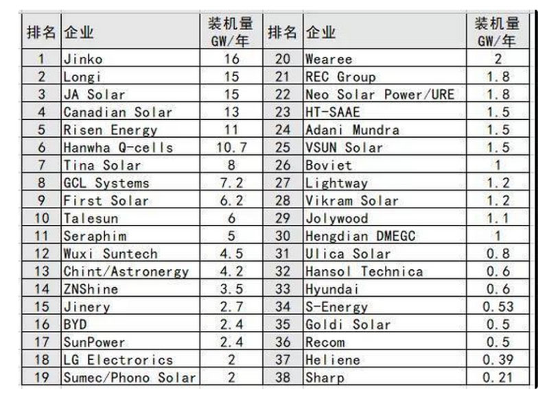 3、獲得BNEF Tier 1評價的光伏組件企業(yè)共38家,合計年產(chǎn)能為156.63GW,約占全球光伏組件產(chǎn)能的70%;排名前六名的組件制造商年產(chǎn)能都在10GW以上。