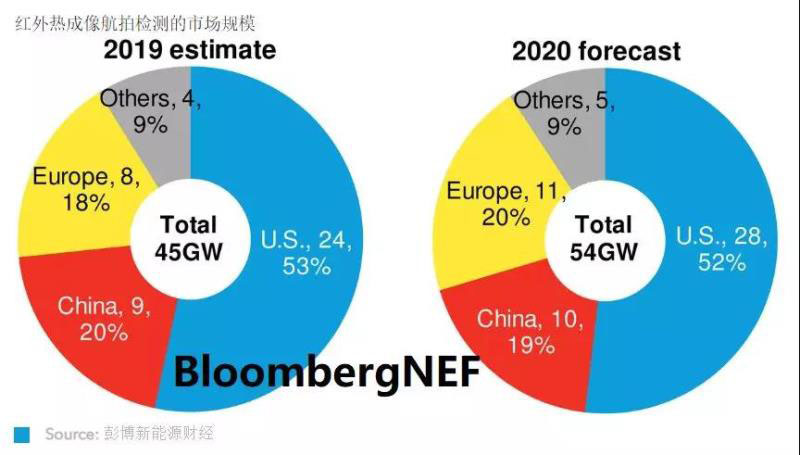 服務提供商根據(jù)光伏項目的規(guī)模來確定檢測量,但是同一項目需要重復檢測多次。業(yè)內(nèi)規(guī)模最大的服務提供商是總部位于加拿大的Heliolytics,截止2019年,其檢測量達35GW。BNEF估計,對于50GW的光伏項目,紅外檢測量約80GW。