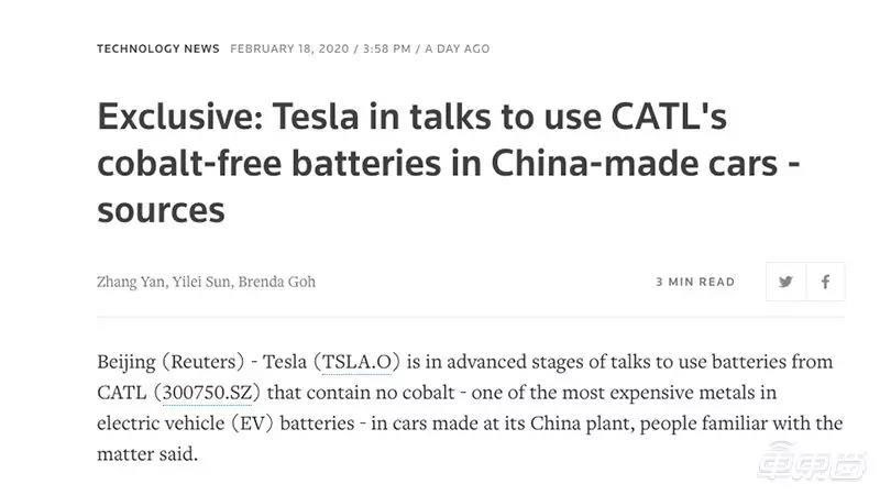 此外,路透社還報道,特斯拉正在與寧德時代就“無鈷”電池進(jìn)行進(jìn)一步商談,特斯拉未來很可能會使用寧德時代生產(chǎn)的“無鈷”電池。