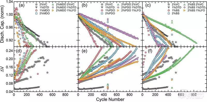 實(shí)驗(yàn)結(jié)果顯示,分別向電解質(zhì)中添加2%碳酸亞乙烯酯+1%硫酸乙烯、2%氟代碳酸乙烯酯+1%二氟磷酸鋰、1%二氟磷酸鋰這三種電解質(zhì)添加劑組合,能使電池循環(huán)壽命有效增長。