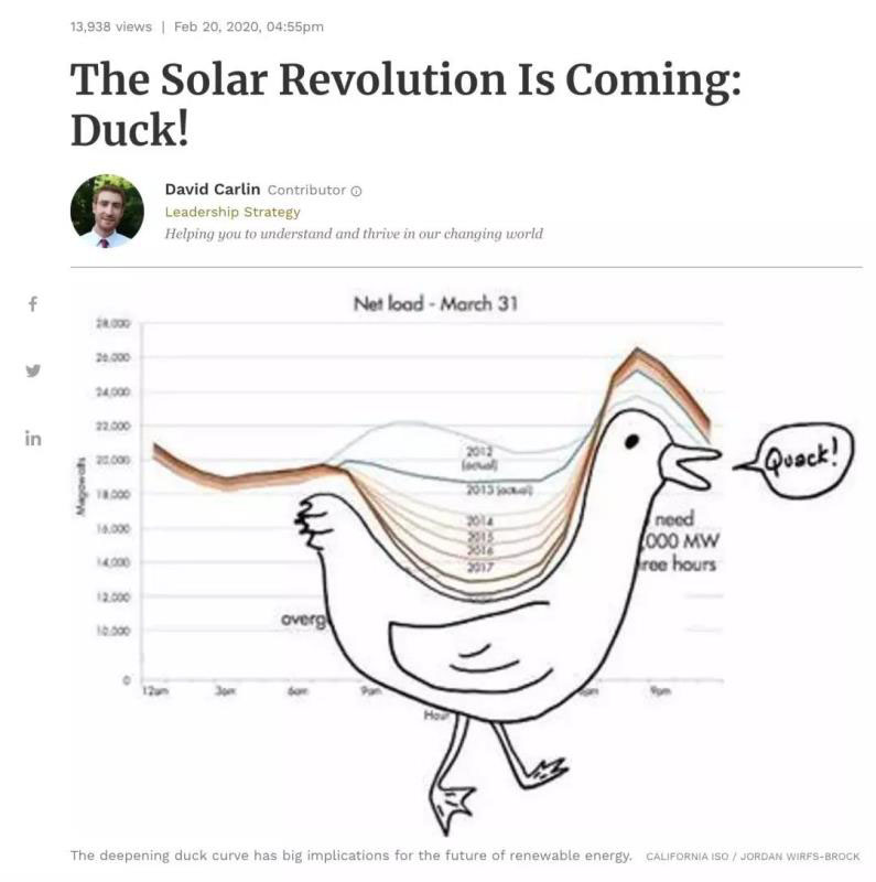 福布斯網(wǎng)站發(fā)表署名David Carlin的文章,題目是:The Solar Revolution Is Coming: Duck! 前一句的意思是“太陽(yáng)能革命正在到來(lái)”,這里Duck是雙關(guān)語(yǔ):一方面是指太陽(yáng)能光伏帶來(lái)的負(fù)荷“鴨子”曲線,另一方面是指如何因勢(shì)利導(dǎo)應(yīng)對(duì)這個(gè)鴨子曲線。