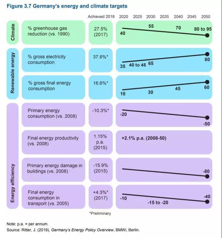 國(guó)際能源署發(fā)布德國(guó)能源政策評(píng)估報(bào)告,其中匯總了德國(guó)能源轉(zhuǎn)型各項(xiàng)目標(biāo)的進(jìn)展數(shù)據(jù):